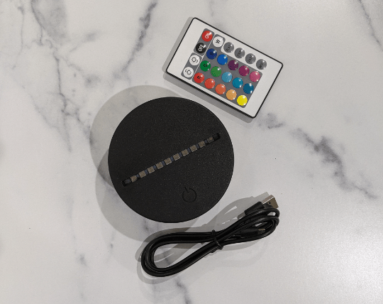 Includes: Acrylic Engraving, Color Changing Lamp Base, Lamp Remote Control & USB cord.