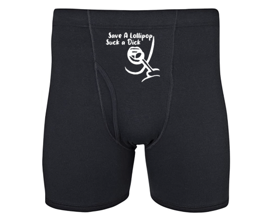 Black Boxer Briefs with Save A Lollopop, Suck A Dick Graphic on the front on the Front in your choice of colors