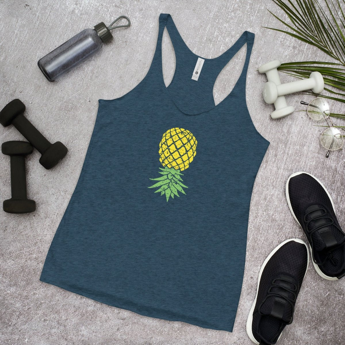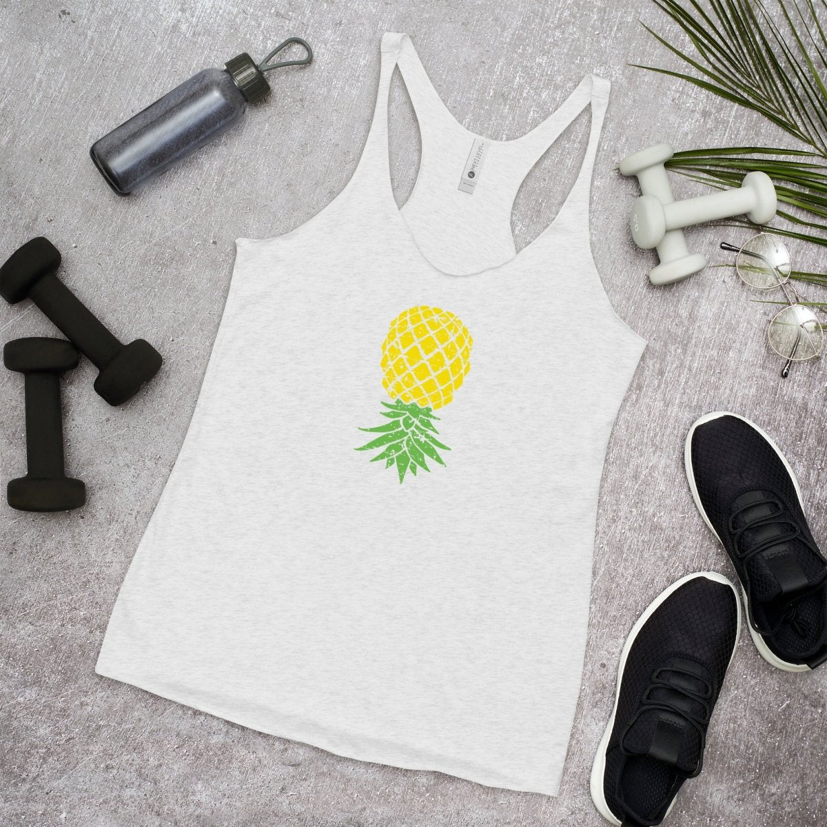Racerback Tank with Grunge Upside Down Pineapple on the front! Perfect to wear or gift for any occasion! Available in Women's sizes.